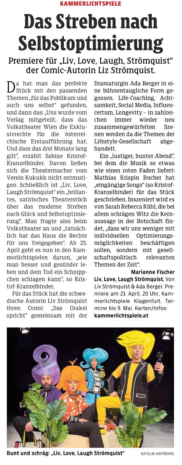 „Liv, Love, Laugh Strömquist“ ist ein brillantes, satirisches Theaterstück, das das moderne Streben nach Glück, Selbstoptimierung und Longevity auf die humorvoll‐spitze Bühne bringt. Mit
